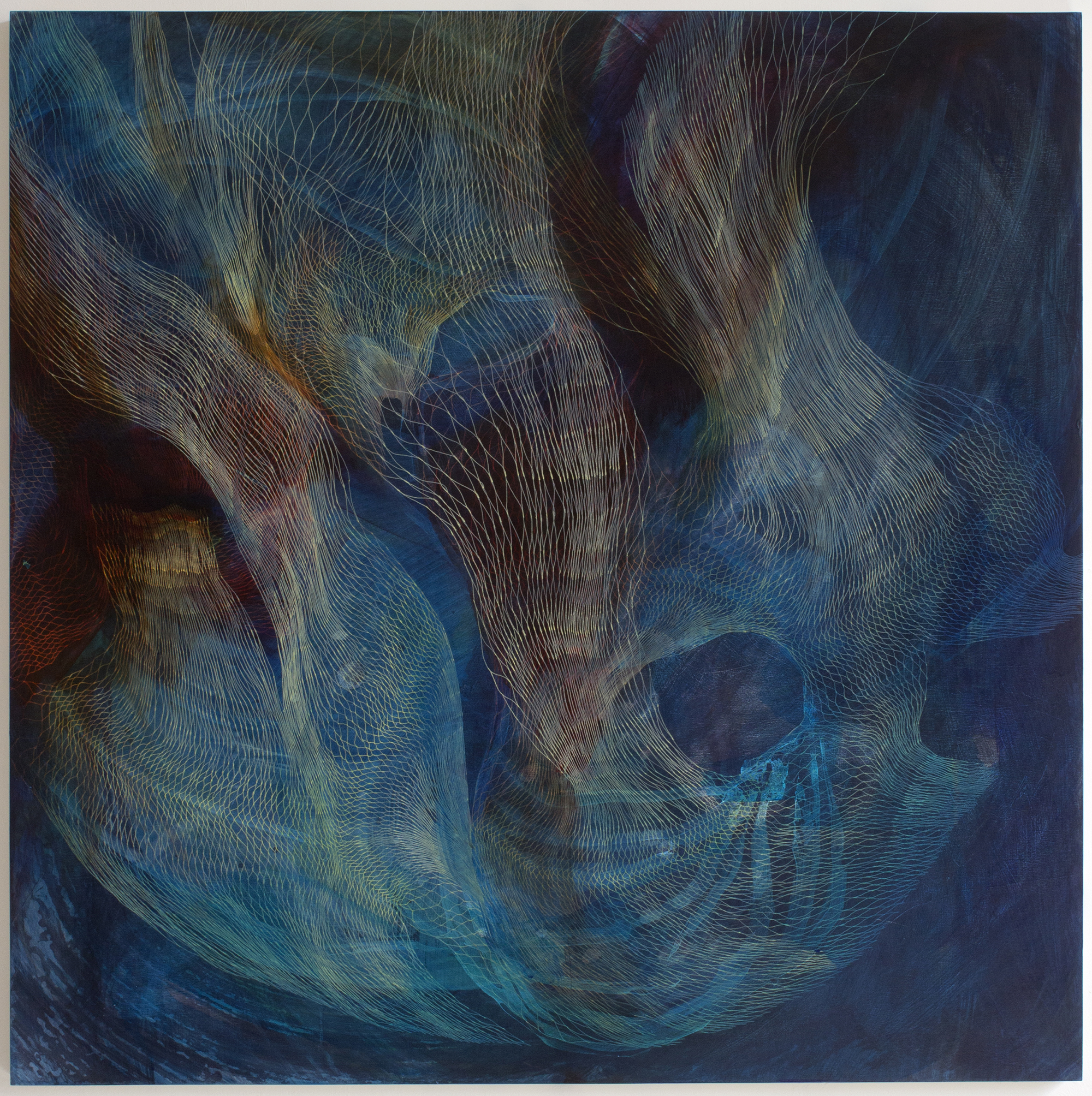 “I look at natural structures that replicate at different scales and imagine their invisible, vital, animating energy. I think about the cosmic forces, tides and elements that impact the world around me and space beyond. I am drawn to patterns I observe both in nature and the man-made environment and the way objects and places are shaped by their interactions, particularly by the repetitive rhythms of life. There is a grounding in pattern, a security that things will continue, like reaching the edges of a map, there is a certainty that the terrain extends beyond the visible. Each painting starts with an idea which can come from all kinds of research or sources whether that’s in quantum physics, literature, a fleeting moment of realisation, a heart-moving observation of colours in a landscape; it could be a feint inkling or a concrete brief for a commission but in the end that doesn’t matter. When someone else sees that painting they bring their own life experience, their niche knowledge to it and it becomes something else, something personal to them and that, for me, is the magical moment where the art takes on a new life.”