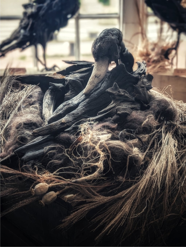 The wood is blackened through charring and iron staining, hinting at a phoenix-like rebirth through fire. Each